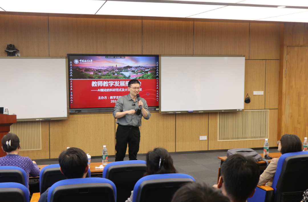 2024年11月8日,教学支持中心、教务处举办教师教学发展活动,邀请之江实验室数据枢纽与安全研究中心专家谢阳斌副教授主讲,主题为“AI驱动的科研范式及大学教学变革”。教学支持中心副主任姜永玲教授主持报告会。